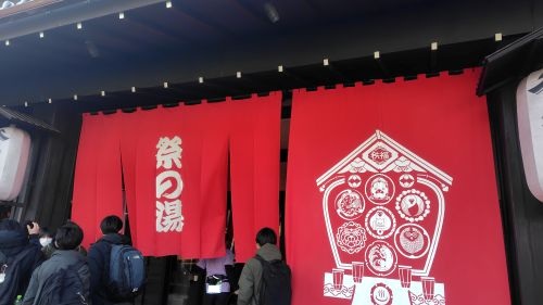 平田さんを追って祭りの湯へ。暖簾をくぐった後ろ姿が見切れてるwww
