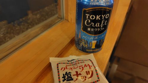 バス出発時刻の25分前に無事到着。mayaさんから頂いたおつまみを食べつつ寝酒のビールを飲む至福の時。
