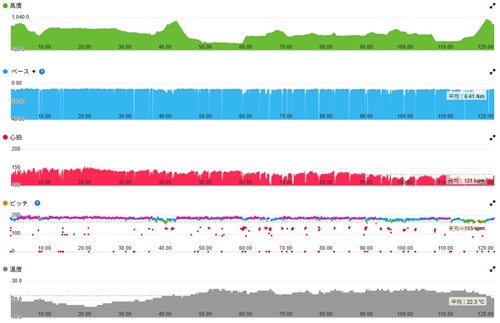 その後の上り基調がどうにも走れず、歩いたり走ったりで8:00/km前後でなんとか進む。
