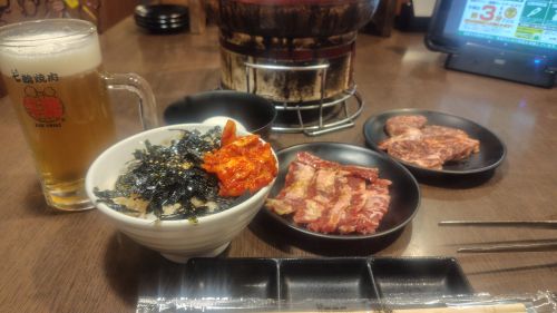 ハイランドステーションイン隣の焼肉店で夕食。食べ放題の方がお得感あるけど、たらふく食ったら翌日のレース走れなさそうなので単品で我慢我慢。