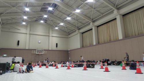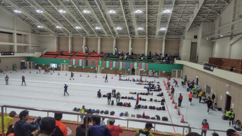 ダラダラと準備して荷物預けて体育館の二階席でくつろいでました。