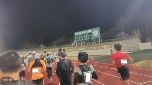 トラック周回中に100km出走で外周で応援してくれてた、ごんされす山田さん見つけて行ってきますと手を振る。