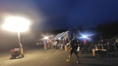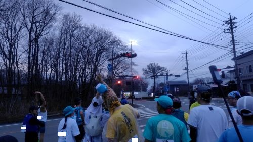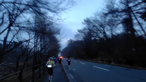 競技場から出る時にライト点灯して出発。序盤は人が多く前に出ようとしても疲れるので、前方のペースに合わせつつZenshinさんとおしゃべりしながら6:30/kmくらいで進む。