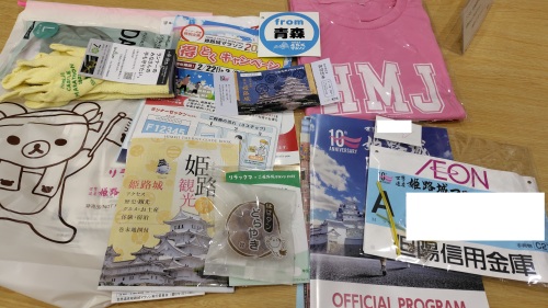 ゼッケン、ICチップ、荷物札、参加賞Tシャツ、軍手系の手袋、キッチン用手袋、どらやき、姫路城無料券、パンフレット等をリラックマの袋に入れて受取り。