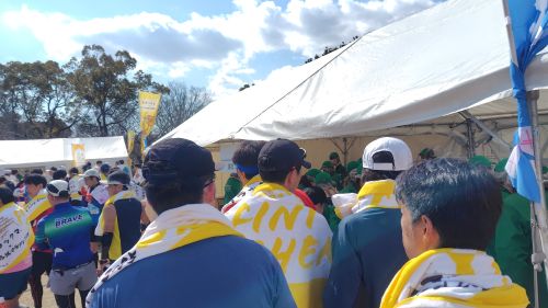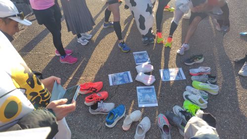 シューズ円陣で元気をもらって荷物預けに移動。