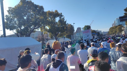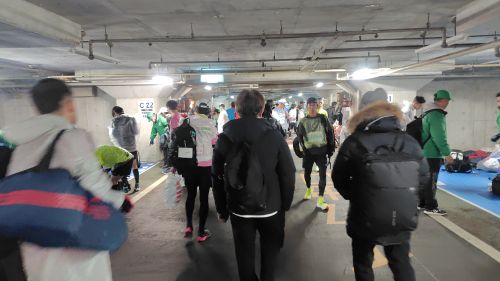荷物を預けた後は、やっぱ寒いしなーとポケッタブルパーカーを着たままアップゾーンで体を温め、スタートブロックに移動しようとすると一際目立つビールマンを発見。