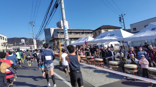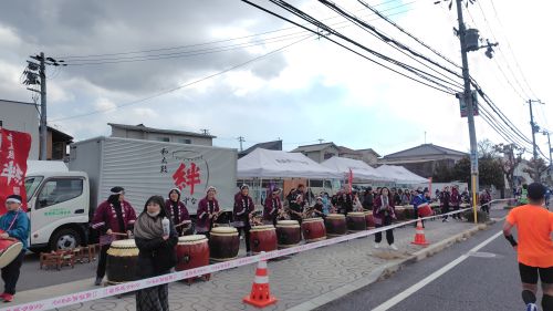 鳴子を鳴らして踊りで応援いただくも4:35/kmまでペース落ちて来たorz