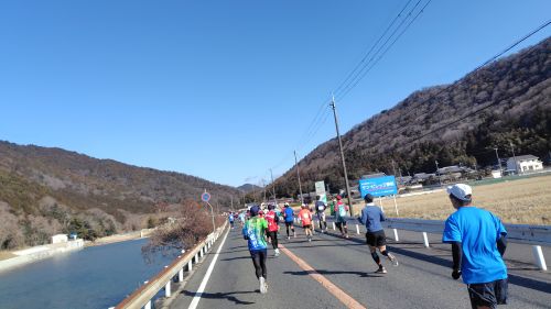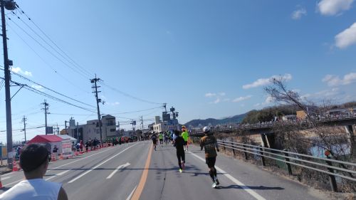 川沿いの道は沿道の応援が近いなー。声かけにありがとうとなんとか進む。