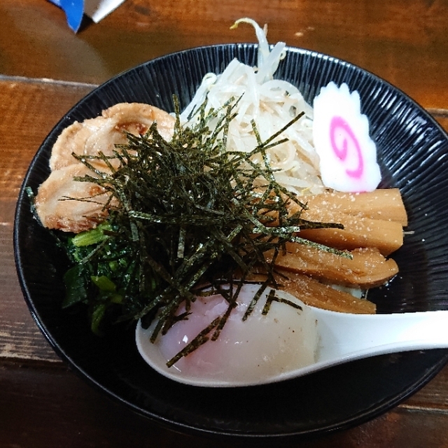 ひき肉、もやし、ねぎ、ほうれん草、なるとと海苔が乗った中太麺をまぜまぜしてほおばると、モチモチの麺と適度な辛味がいい感じ。