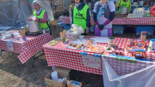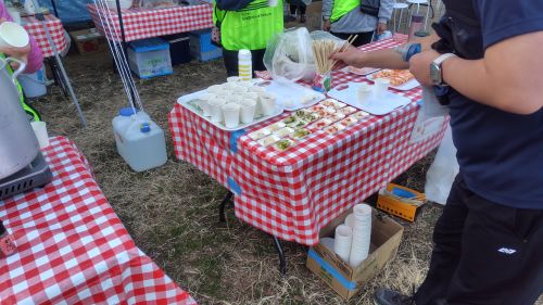 コケて膝流血しちゃってと会話しつつ、豚汁とお稲荷を美味しくいただき、水を補充してみかんを食ってエイドアウト。