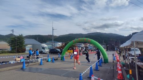 ANDO_食いつつ進み、その後何名か後に髙村さんとスライドし、エイドが見えてきたら櫛引さんが力走!
