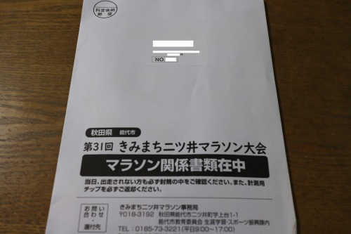 能登の国ジャーニーランでやらかした右ケツがにまだにやにやしておりますが、2週後に迫った第31回きみまち二ツ井マラソンのナンバーカード等が到着しました。