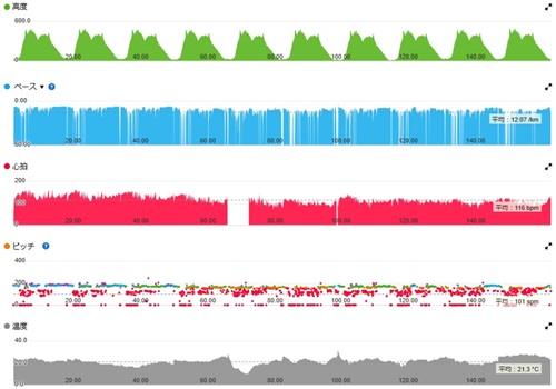 入りの1周は3時間前後で考えていたのですが、上りの足が元気な内は石投山もそこまでのハードさは感じず、下りは急傾斜が少なく走りやすく、終盤のロードの下りは惰性で進める安心感という絶妙さで、想定より30~40分速く気持ちよく走れるコースでした。