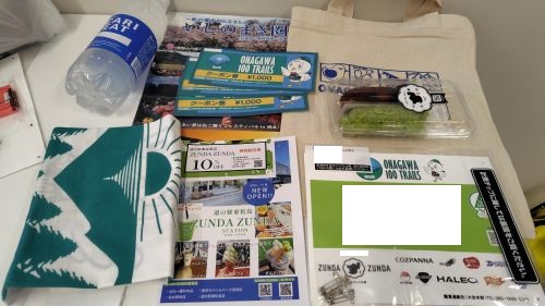 参加賞の手ぬぐいと地域振興券、ずんだ団子&あん団子、ポカリスエット、ゼッケンとパンフレットをONAGAWA ALLSTARSのバッグに入れて受け取りました。