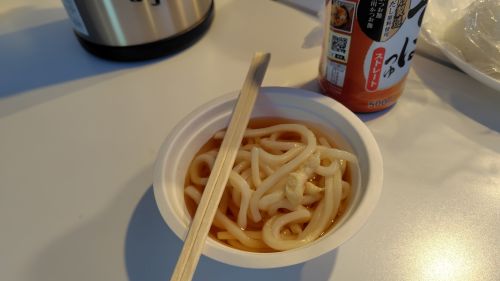 スポドリとお湯を補充し、あったかいうどんに生姜を入れて食べる。胃のトラブル防止に生姜がいいよね。