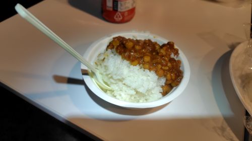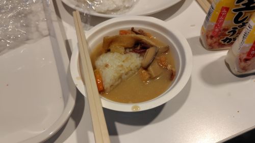 よひさんが残り2周で眠そうにカップヌードル食べてた横でカレー食いつつ、残りちょっとだから頑張ってくださいと送り出す。
