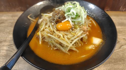 もやし炒めたっぷりの味噌ラーメンに、キムチと納豆と卵黄が乗っかり麺が見えないボリューム。