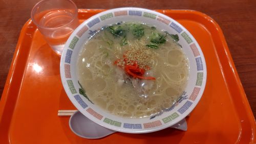 店外の券売機で\290のラーメンの食券買って店内へ。食券を出してセルフで水を飲みつつしばし待つと豚骨ラーメンの方と呼ばれて取りに行く。