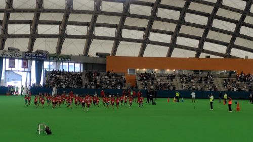 フィールド内で少しアップしてたら開会式開始のアナウンスがあり観客席へ戻る。