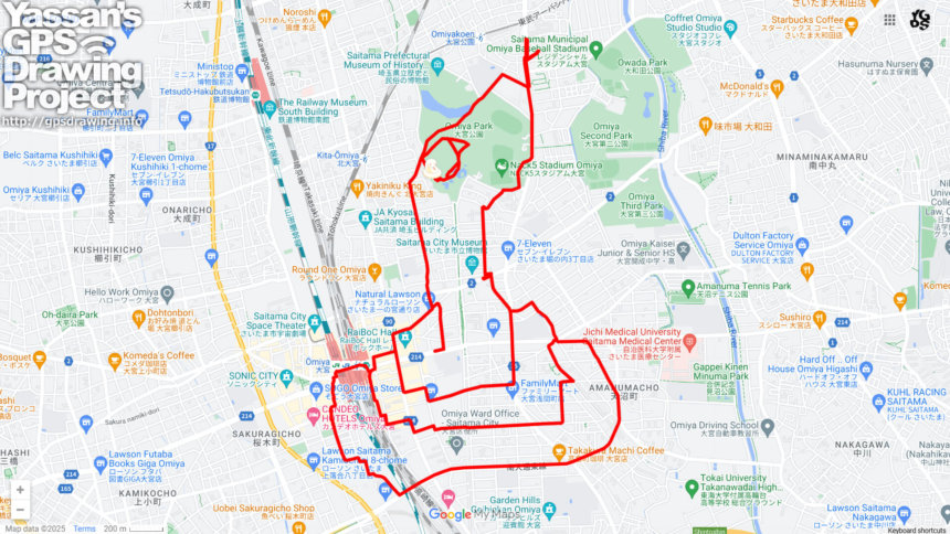 雨は霧雨程度だったので大宮駅のコインロッカーに荷物を預け、ポケッタブルパーカー羽織ってGPS絵画スタート。
