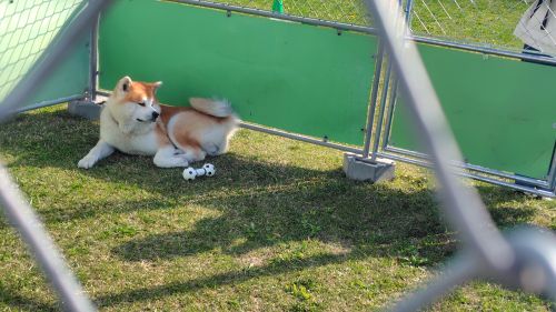 700円券で何買おうかなと会場内の飲食ブースを散策し、一旦外の露店も見とくかと出たら、秋田犬ブースでけんじんさん夫妻とご挨拶。