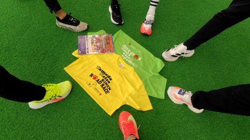 イエローグリーンとイエローの参加Tシャツをセンターにシューズ円陣。