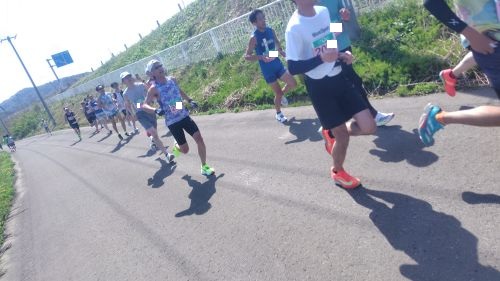 気持ちよく進んでたが5km手前の上り基調で離され始め、上りきって右折したエイド手前で最後尾スタートのこわだ君に軽やかに抜かれる。