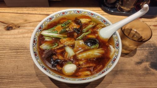 熱々の五目あんがかかった広東麺。豚肉と海老と白菜などの野菜にうずらの卵も入ってボリューミー。